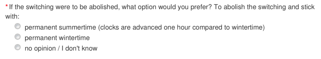 確かに、欧州委が行ったパブリックコメントのアンケート原本を確認すると、「永久に夏時間」か「永久に冬時間」どちらが良いか選ぶ質問がある。