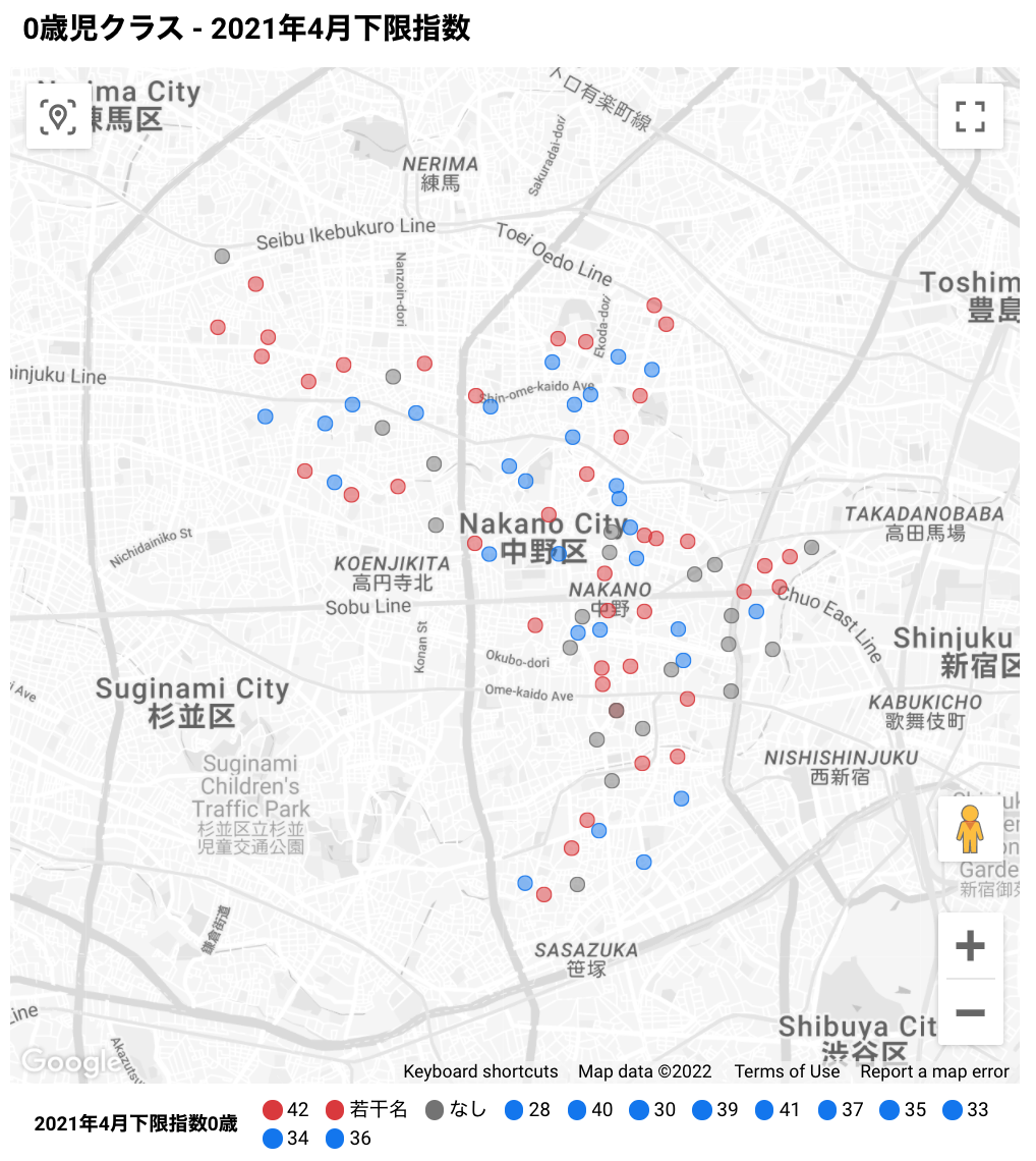 公表されている2021年4月入園者のデータを使って、当時42点で確実に入れた保育園を青色、確実に入れたとは言えない保育園(つまり最低点が42点以上)を赤色で、0歳児クラスと1歳児クラスについてGoogleマップにプロットしたものがこちらです。